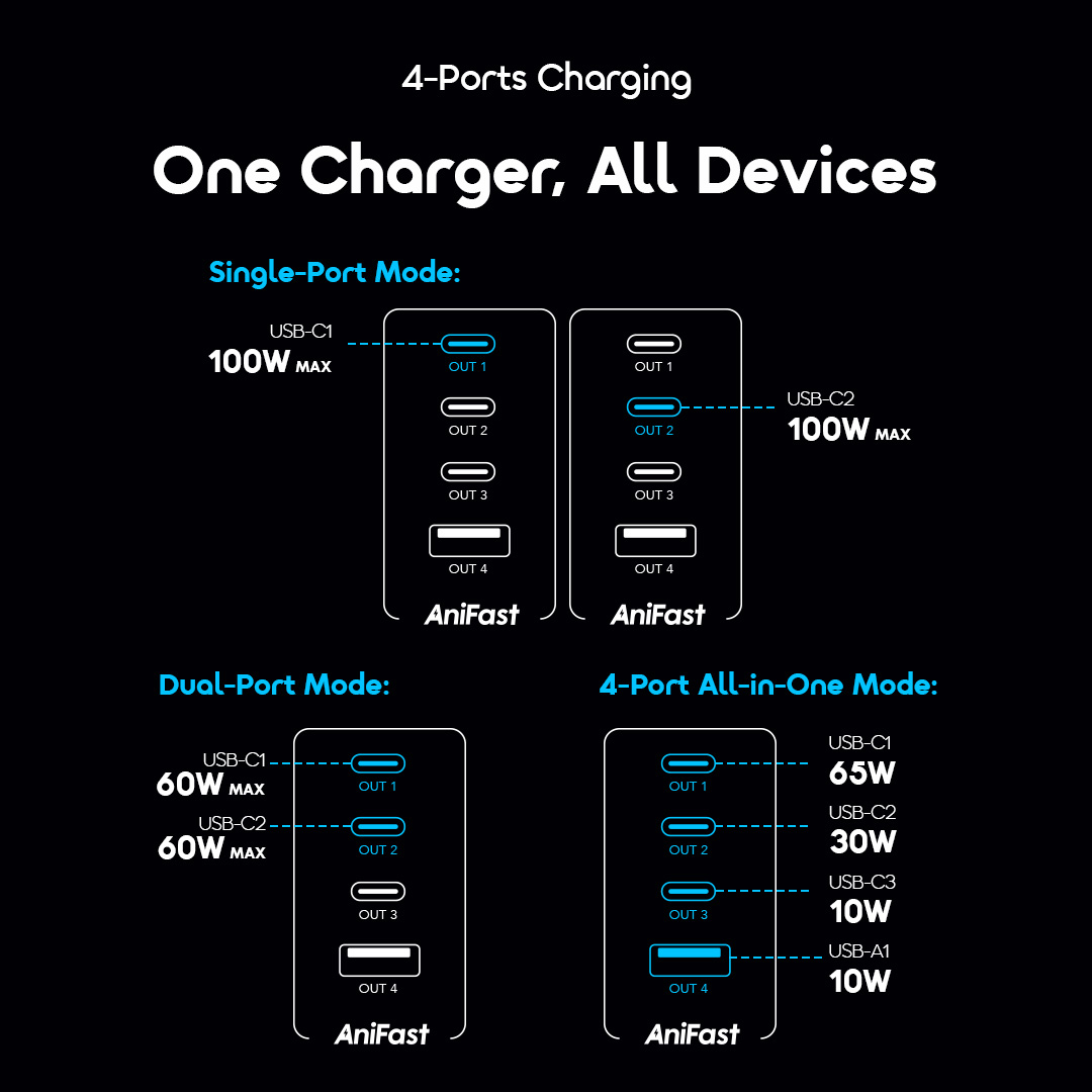 Output 1(Type-C)+Output 2(Type-C)+Output3(Type-C)+Output 4(USB-A):65.0W+30.0W+10.0W+10.0W/30.0W+65.0W+10.0W+10.0W, 115.0W Max