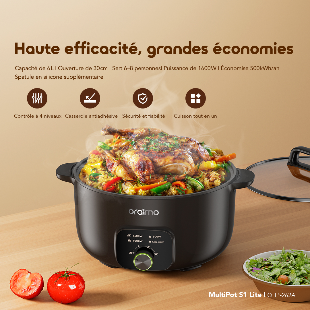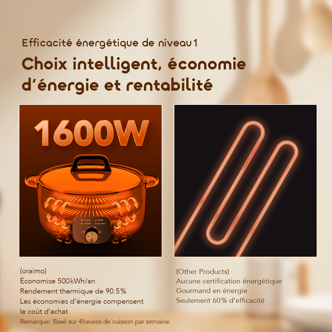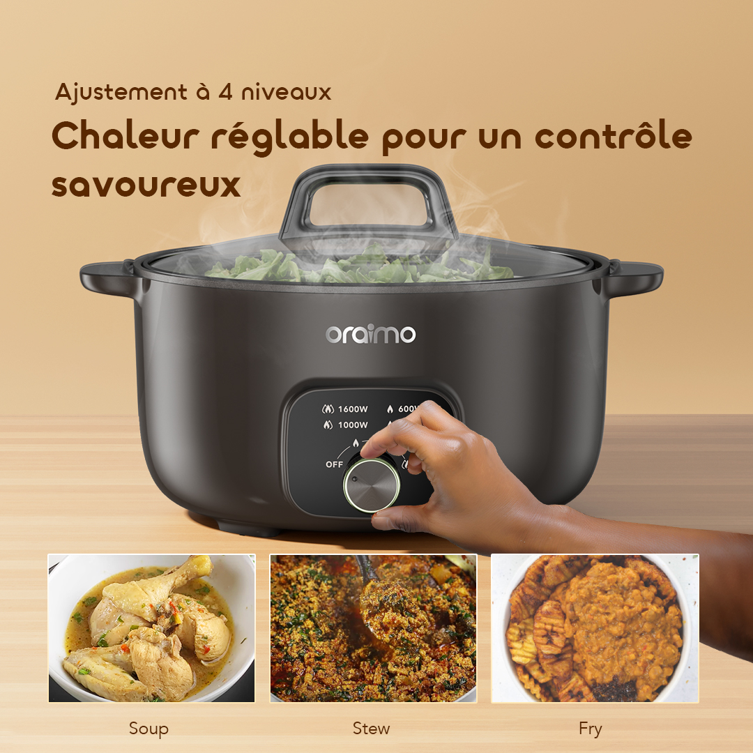 Quatre niveaux de chaleur réglables, de 0W à 1600W, vous permettent de passer facilement de l’ébullition rapide à la cuisson lente.