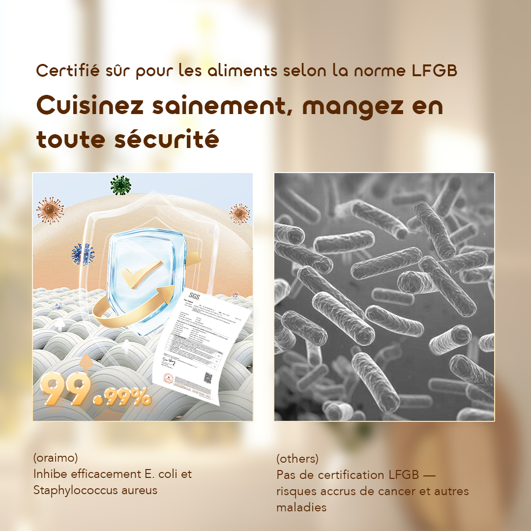 Certifié LFGB pour contact alimentaire, afin de réduire efficacement les bactéries nocives — garantissant des repas sains et sûrs pour toute la famille.