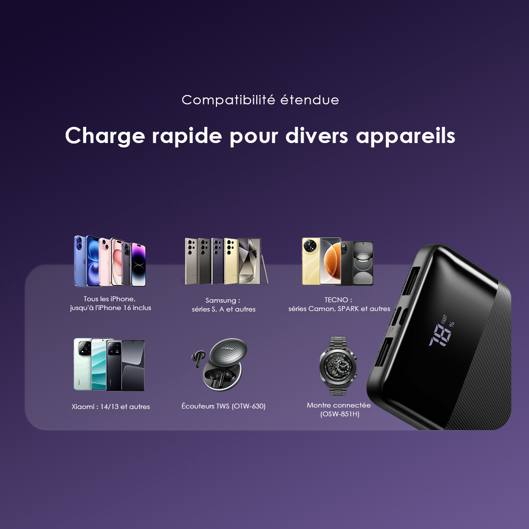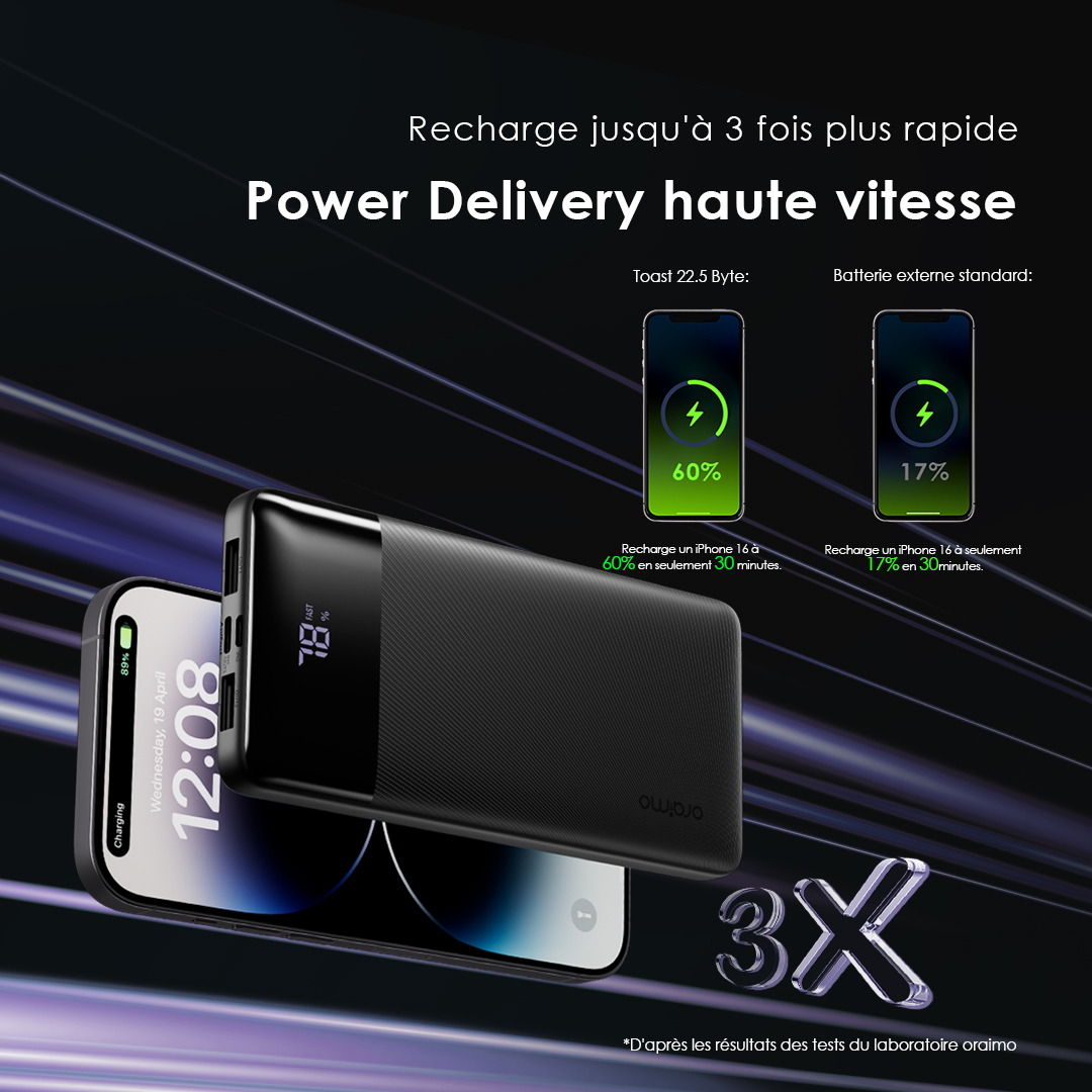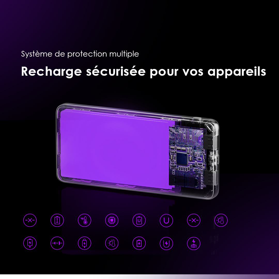 Le port Type-C offre une recharge rapide 22.5W pour vos appareils et une recharge accélérée 18W pour la batterie externe. Profitez d’une alimentation rapide dans les deux sens !